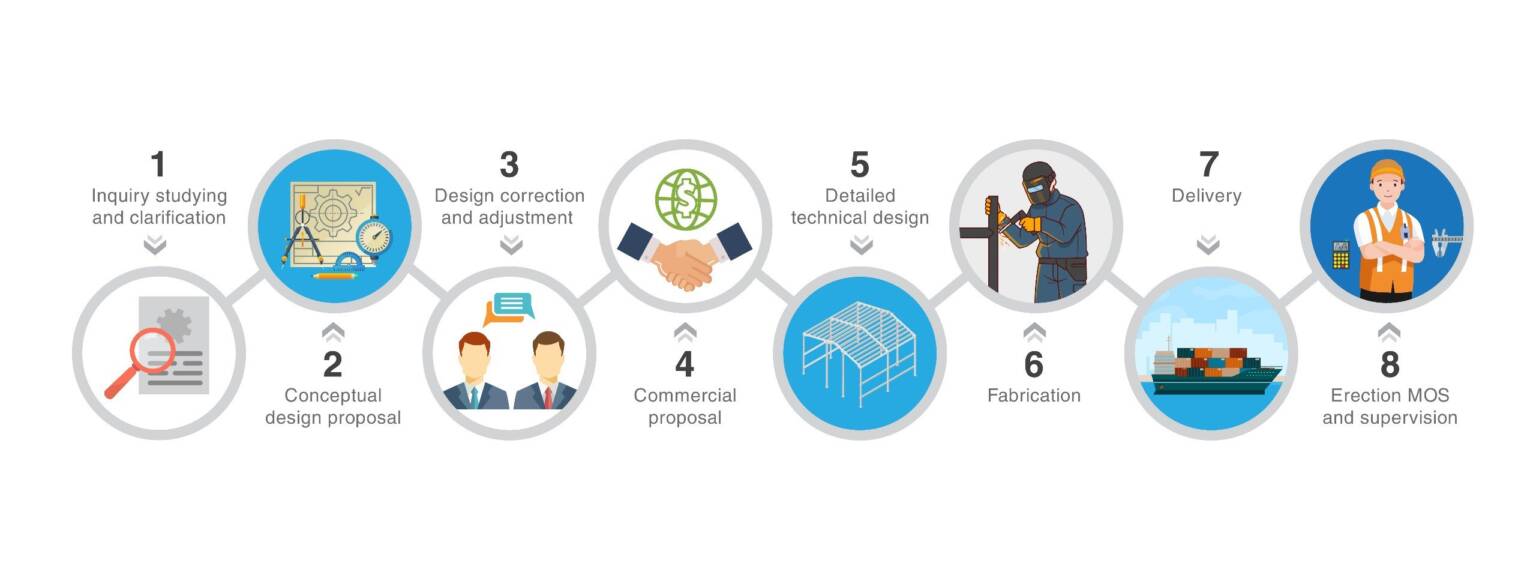 At ICONIX Steel, we ensure a seamless and efficient process from initial inquiry to the final erection of your pre-engineered building. Below is a step-by-step overview of our procedure: